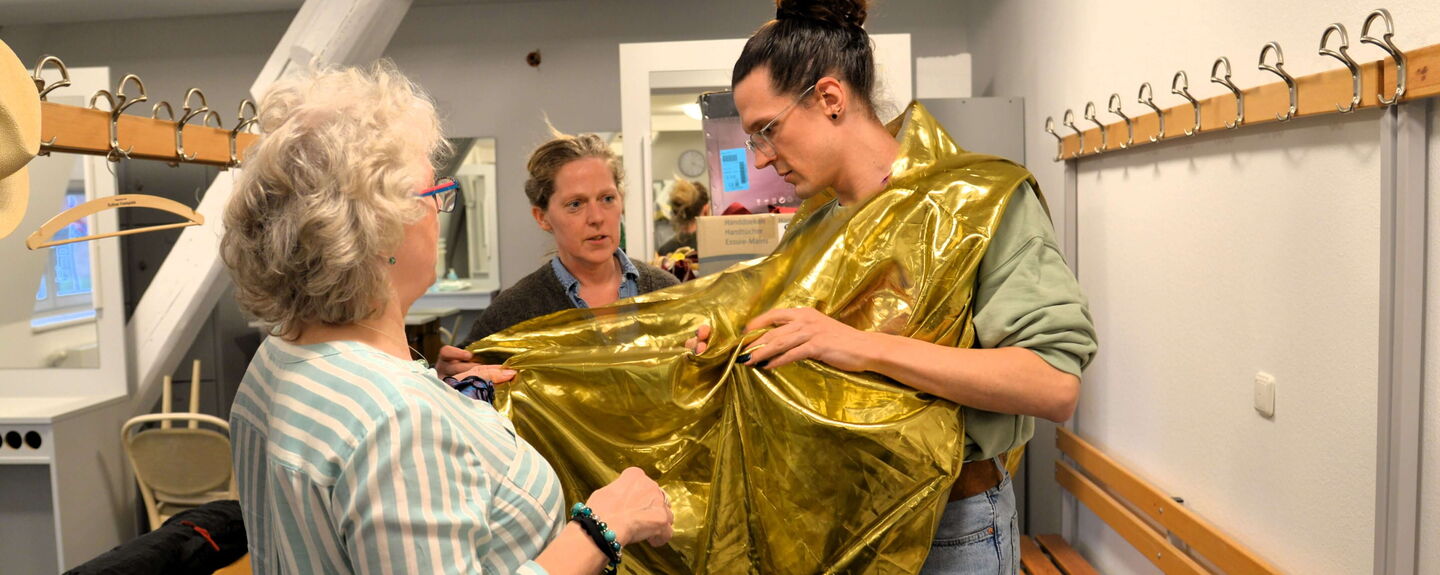 Acht Schneiderinnen werden in Kürze mit dem Zuschneiden der Stoffe und dem Nähen beginnen. Angelika Wallbrecht, die ganzjährig in der Kostümabteilung der der Eutiner Festspiele tätig ist, hat die Leitung der Organisation übernommen. Bei den ersten Vorbereitungen stehen ihr Nike Leistner zur Seite, die ein Freiwilliges Soziales Jahr Kultur in Eutin absolviert, sowie Katja Schröder, die zu den sieben für diese Saison angestellte Schneiderinnen gehört.