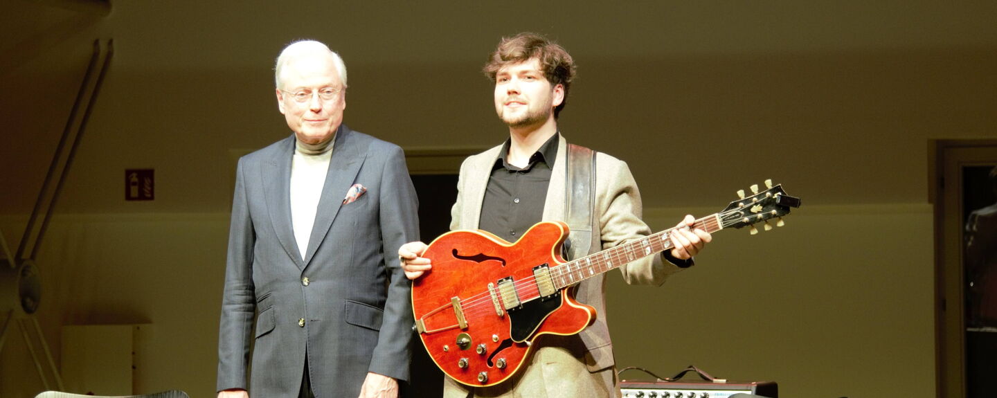 Rueß, Jahrgang 1998, ist in Bad Schwartau aufgewachsen und lebt in Berlin, er ist Gitarrist, Komponist und Produzent, erhielt 2019 den Lübecker Jazzpreis und tritt unter anderem mit einem eigenen Trio auf. Neben den gefühlvoll arrangierten Standards präsentierte er in Eutin auch ein selbst komponiertes Stück mit dem Titel „Für Opa“, eine Hommage für seinen Großvater für dessen Unterstützung in seiner Kinder- und Jugendzeit.
