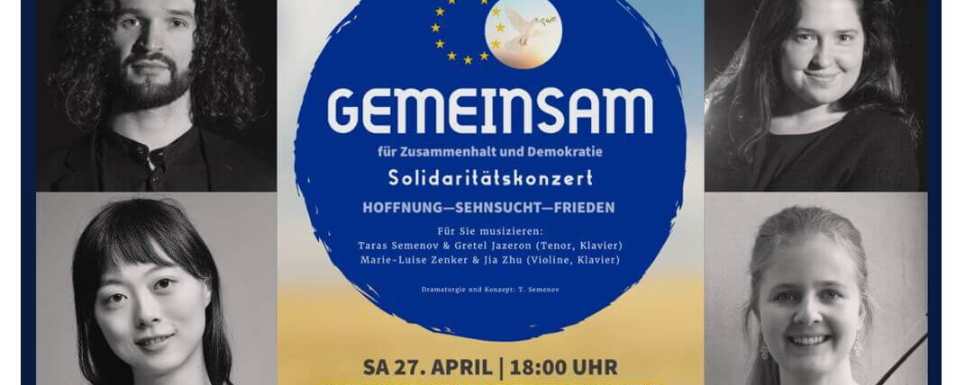 Unter dem Motto „Gemeinsam für Zusammenhalt und Demokratie: Hoffnung, Sehnsucht, Frieden“ musizieren zwei aufstrebende Duos: Taras Semenov und Gretel Jazeron (Lied-Duo) sowie Marie-Luise Zenker und Jia Zhu (Violine, Klavier). Sie präsentieren das Programm "Requiem: Lieder von der Ewigkeit".