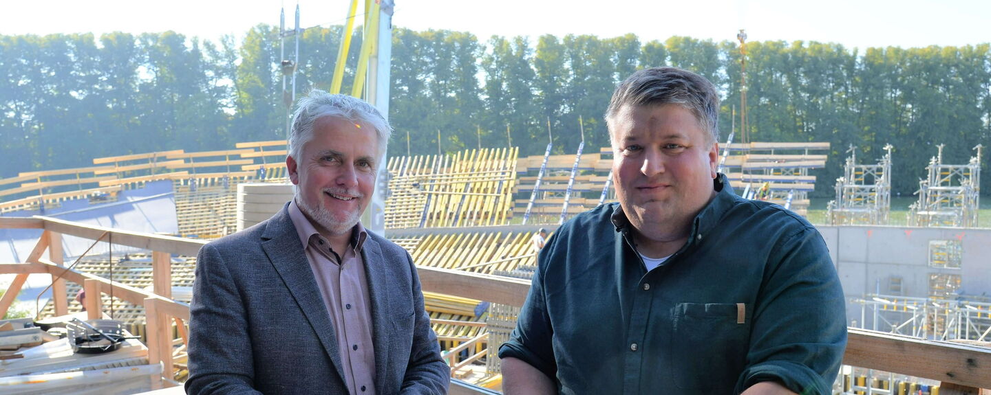 Es ist ein Moment von historischer Bedeutung für die Stadt und die Festspiele: Der künftige Betrieb der Freilichtbühne im Schlossgarten ist vertraglich geregelt. Für die Unterzeichnung der Kooperationsvereinbarung trafen sich am 7. September 2023 Bürgermeister Sven Radestock und der Geschäftsführende Gesellschafter der Festspiele, Falk Herzog, auf der Baustelle.