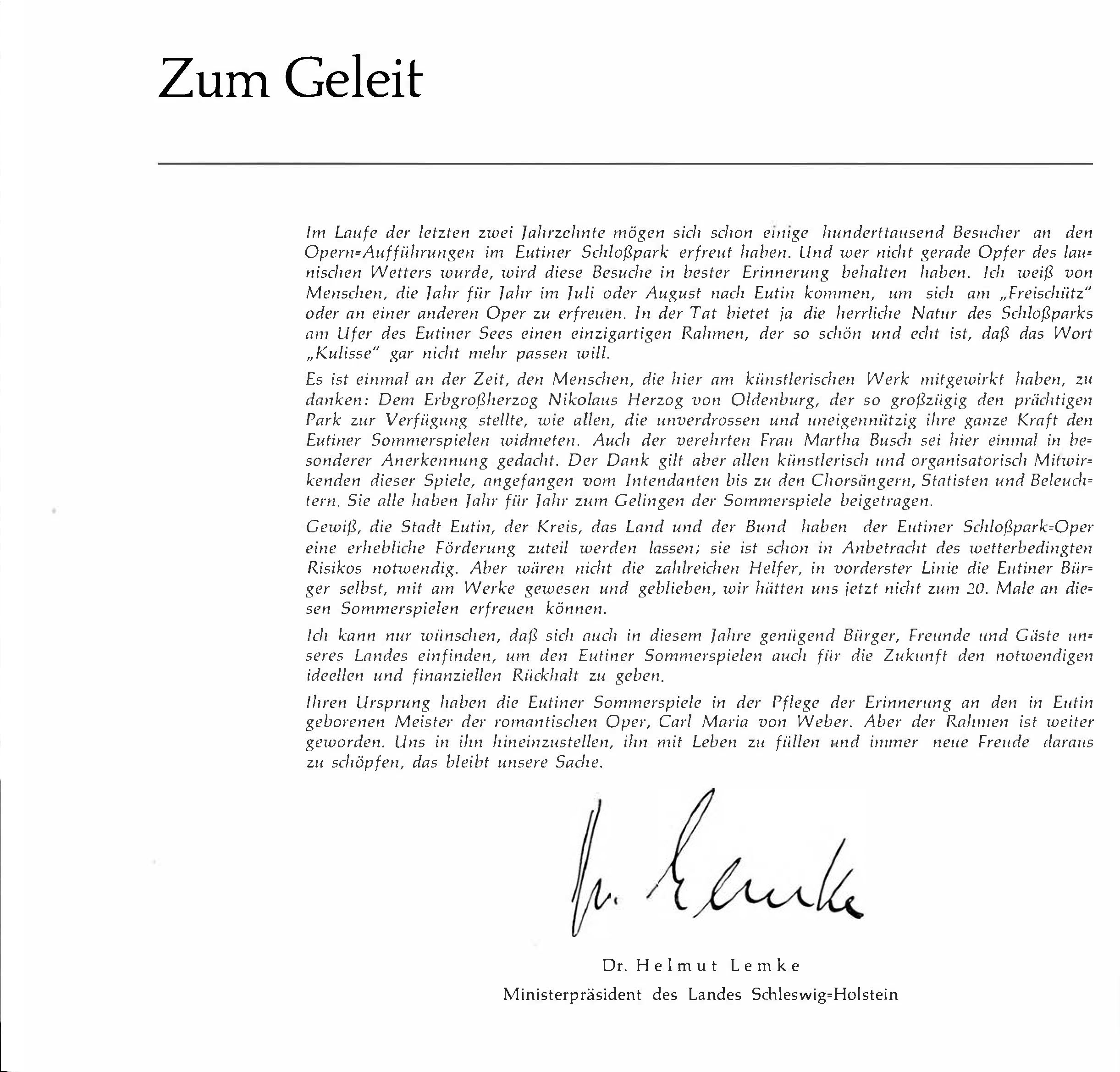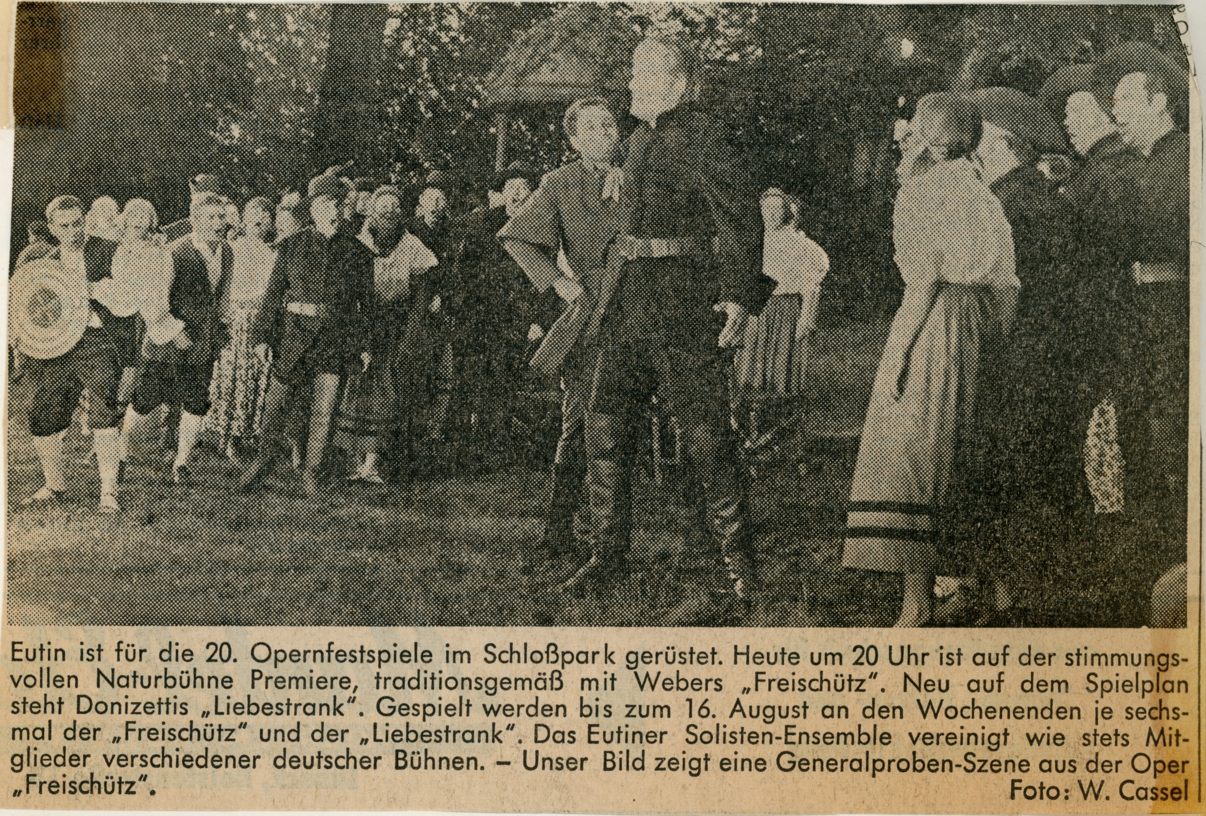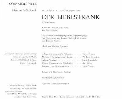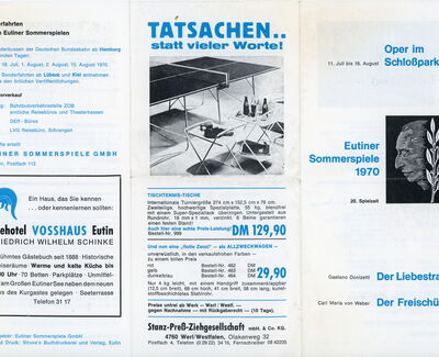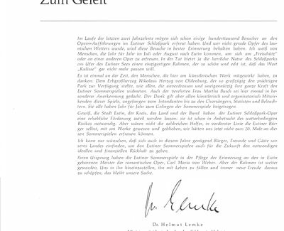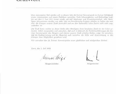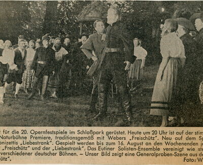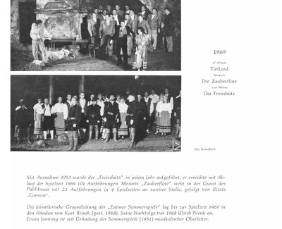 Die historischen Texte und Abbildungen dieser Rückschau (bis in die 1950er Jahre) stammen aus den jeweiligen Programmheften und Fotosammlungen und spiegeln ihre Zeit. Sie könnten Begriffe und Darstellungen enthalten, die heute als diskriminierend oder unangemessen gelten. Die Eutiner Festspiele distanzieren sich daher ausdrücklich von solchen Inhalten. Auch die Erwähnung teils umstrittener Persönlichkeiten erfolgt ausschließlich im historischen Zusammenhang. Der digitale Rückblick soll Geschichte transparent machen und zur kritischen Auseinandersetzung mit Sprache, Haltung und Zeitgeschehen anregen. Wo erforderlich, ergänzen wir erläuternde Hinweise. Hinweise auf sachliche Fehler oder notwendige Kontexte nehmen wir gerne unter info@eutiner-festspiele.de entgegen.