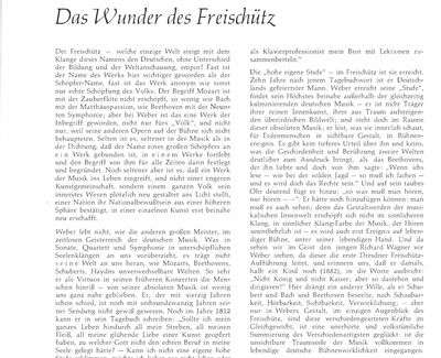 Der Begriff Mozart ist mit der Zauberflöte nicht erschöpft, so wenig wie Bach mit der Matthäuspassion, wie Beethoven mit der Neunten Symphonie; aber bei Weber ist das eine Werk der Inbegriff geworden, nicht nur fürs „Volk“, und nicht nur, weil seine anderen Opern auf der Bühne sich nicht behaupteten.