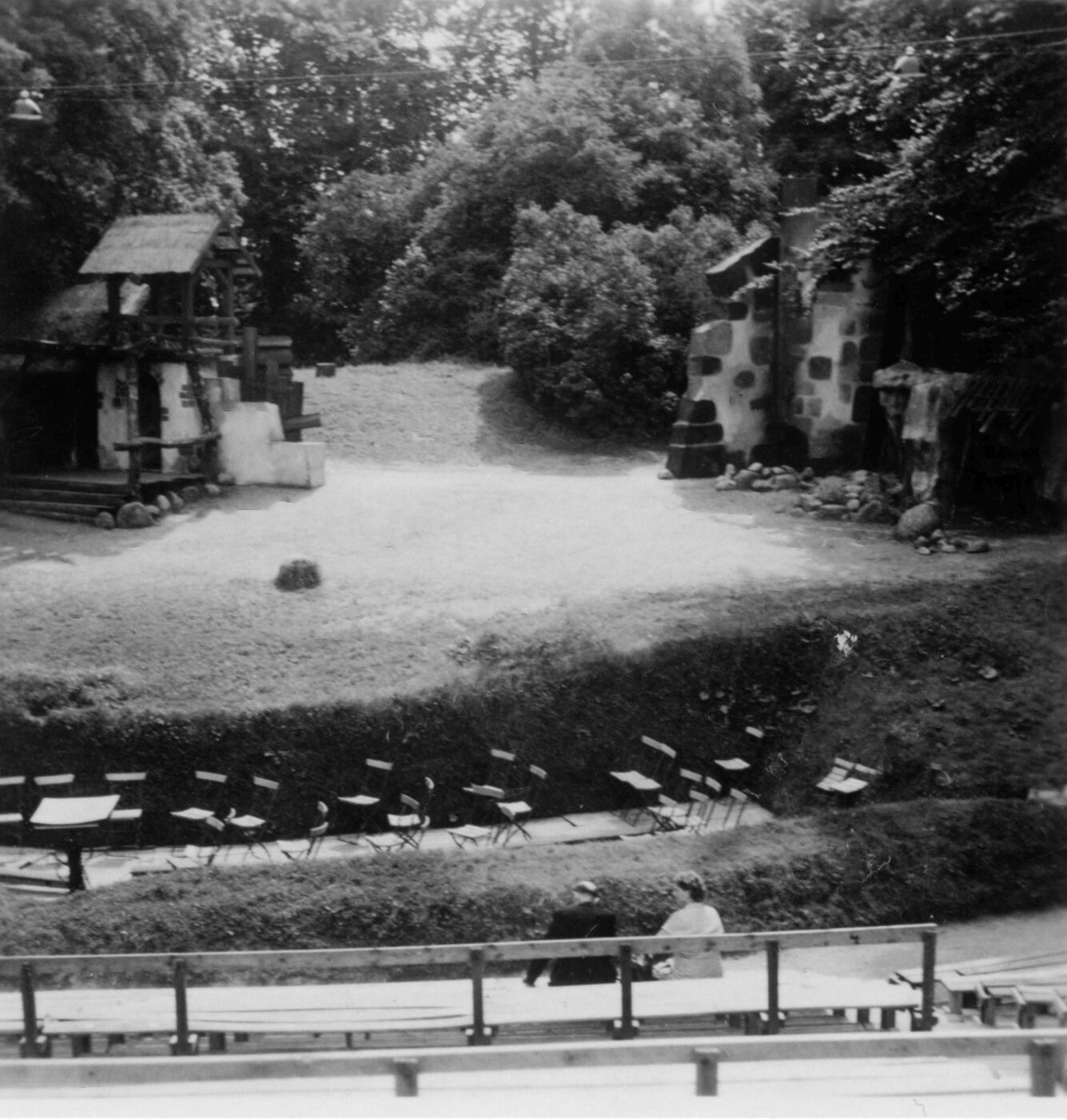 Nur wenig brauchte der Mensch nachzuhelfen, das von der Natur Geschaffene zu einem vollendet schönen Landschaftstheater zu machen. Der Uferstreifen zwischen dem vor fast 170 Jahren im Halbkreis um den breiten Bühnenhügel gelegten Weg und dem See gibt dem Tribünenbau für 1800 Besucher Raum. Wuchtige Kastanien, Linden und ragende Buchen flankieren das Rund der Tribüne oder bilden, die geräumige Spielfläche frei lassend, mit Syringen-, Goldregen- und Jasmingebüsch die Kulissen, wie der Regisseur sie sich nicht besser wünschen kann. Als ferner Prospekt ragen Kastanien und Eichen über hohes Gesträuch. Scheinwerfer sind rings in den Kronen versteckt, und dem Boden angepasst ist das Orchester in einer Versenkung untergebracht.