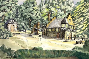 Rote Kleinstadtdächer klettern zu einer Höhe hinauf, auf der über die Baumkronen ein breites Dach aufragt.