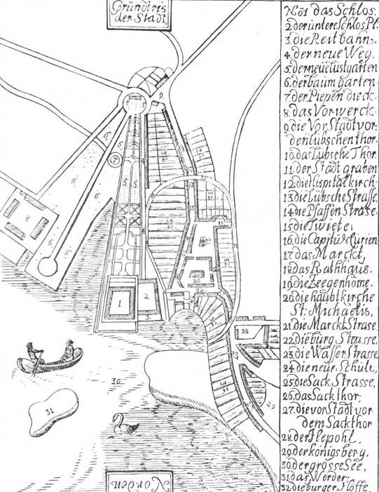 Sie war von See und Sumpf umgeben. Die Höhenmarke am Markt (Rathaus) liegt nur 4 Meter über der des Egelsumpfs vor dem „Sacktor“, des „Ihlpohls“ (vgl. den Stich), der also 1712 schon umbaut war.