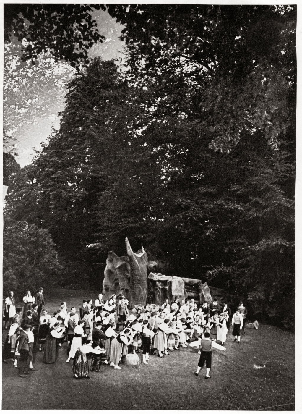 „Wo die Bühne?“ Gemeinsam durchschritten zwei Freunde den Schlossgarten. „Wo ist ein Ausschnitt aus seiner Schönheit, die den verschiedenartigen Erfordernissen gerecht wird?“ – Schwere Entscheidung der mit Bühnenpraktiker-Augen vorsichtig Wählenden! Noch kein Entschluss. „Erst einmal die Sache beschlafen!“ – Neuer Tag: Kurt Brinck sucht und wählt und vergleicht nochmals. Er hemmt den Schritt: „Hier –? Ja –! Hatten wir denn keine Augen? Der freie breite Bühnenhügel, die dichten und wuchtigen Kulissen des Busch- und Baumwerks, der prächtige Prospekt mit seinen fernen riesigen Bäumen, – die Stille, – und – hier – das Tribünenrund am Ufer –!“ Eifrig zum Freund: „Ich hab's –! Komm –!“ Gemeinsam wird sorgfältig alles untersucht, die Akustik nicht zu vergessen. „– Gut –! Sehr gut!“