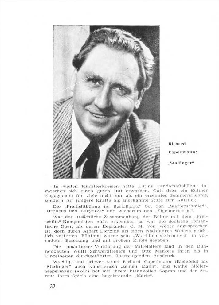 Hermann Rohrbach von der Städtischen Bühne Lübeck (1954 ein wirkungsvoller Heiratsvermittler „Kezal“) wird wie 1952 „Kaspar“ und „Pizarro“ singen. Vom Opernhaus Hannover her taucht Walter Schneemann , 1954 bewährter Darsteller des „Max“ und „Hans“ („Verkaufte Braut“) wieder als Webers „Max“ auf; neben ihm wird Walter Puck (Bühnen der Landeshauptstadt Kiel) den „Erbförster“ spielen.