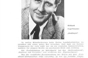 Wenn am 9. Juli dieses Jahres die Scheinwerfer über dem so schönen und reizvollen Anlagen im Eutiner Schlosspark aufhellen, beginnt damit die fünfte Spielzeit der „Eutiner Sommerspiele“. Wieder werden es die unvergänglichen und uns deutschen Menschen so besonders vertrauten Melodien Carl Maria von Webers, des größten Sohnes unserer Stadt, sein, die der künstlerischen Arbeit auch in diesem Jahr Richtlinie und Weihe geben sollen.