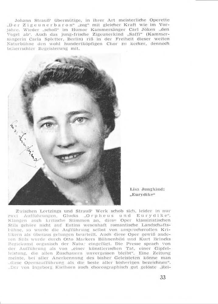 Schwere Aufgaben waren dem Chor gestellt: denn außer dem ihm vertrauten „Freischütz“· sollten „Fidelio“ und der „Zigeunerbaron“ über die Bühne gehen. In den sechs „Freischütz“-Aufführungen sang Christine Görner, Hamburg, „bezaubernd durch die Anmut ihrer Person“ das bewegliche „Ännchen“. Webers „Agathe“ und Beethovens „Marcellina“ gleich wirkungsvoll darzustellen: das war Aufgabe und Erfolg der reifen Kunst Tresi Rudolphs.