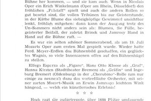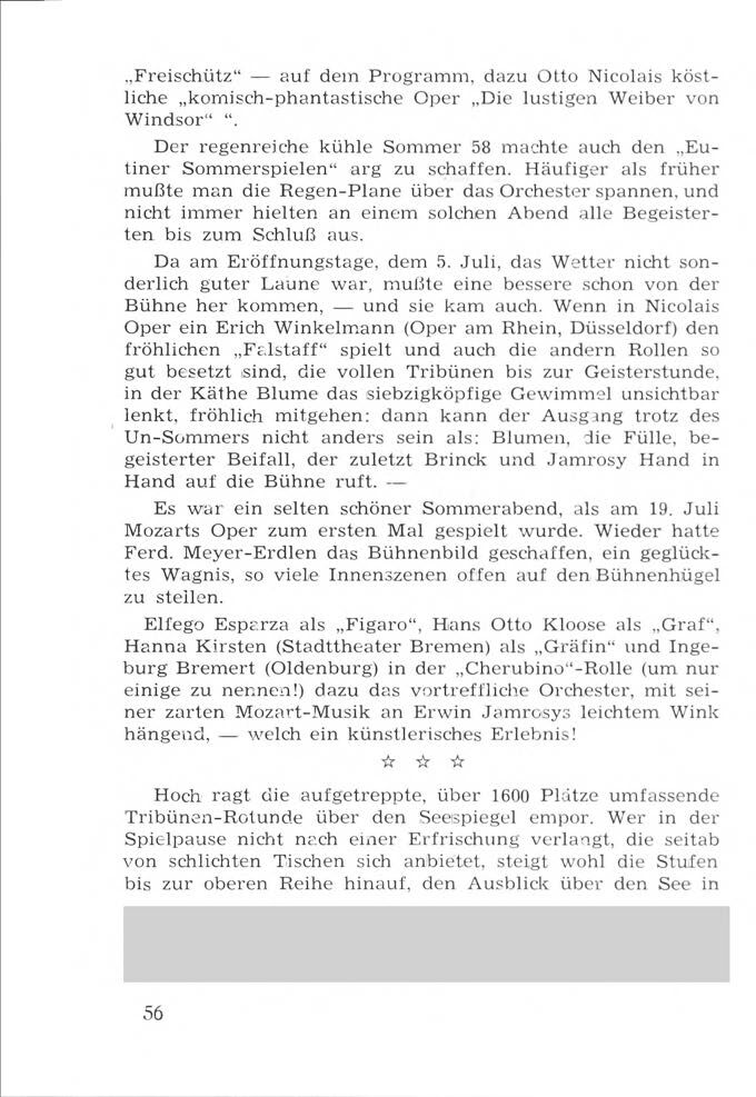 Zum 10. Male finden in diesem Jahre die Sommerspiele im herrlichen Eutiner Schlosspark statt. Aus kleinen Anfängen, einer Festaufführung des „Freischütz“ anlässlich des 125. Todestages Carl Maria von Webers im Jahre 1951, hat sich eine Kulturstätte mit bemerkenswertem Niveau entwickelt, die sich über die Grenzen der Bundesrepublik Deutschland hinaus ein gutes Ansehen erworben hat.