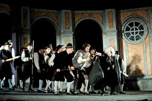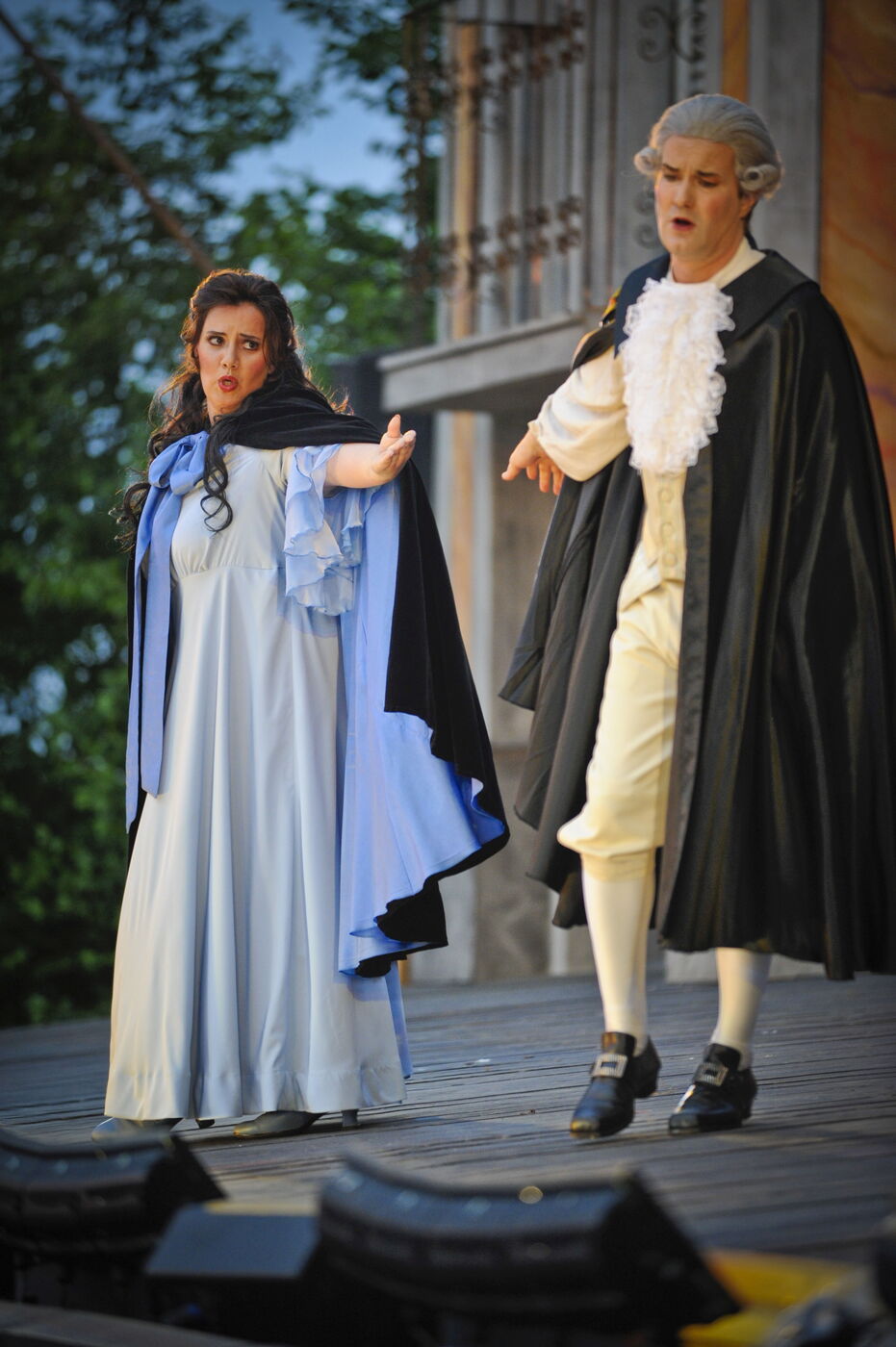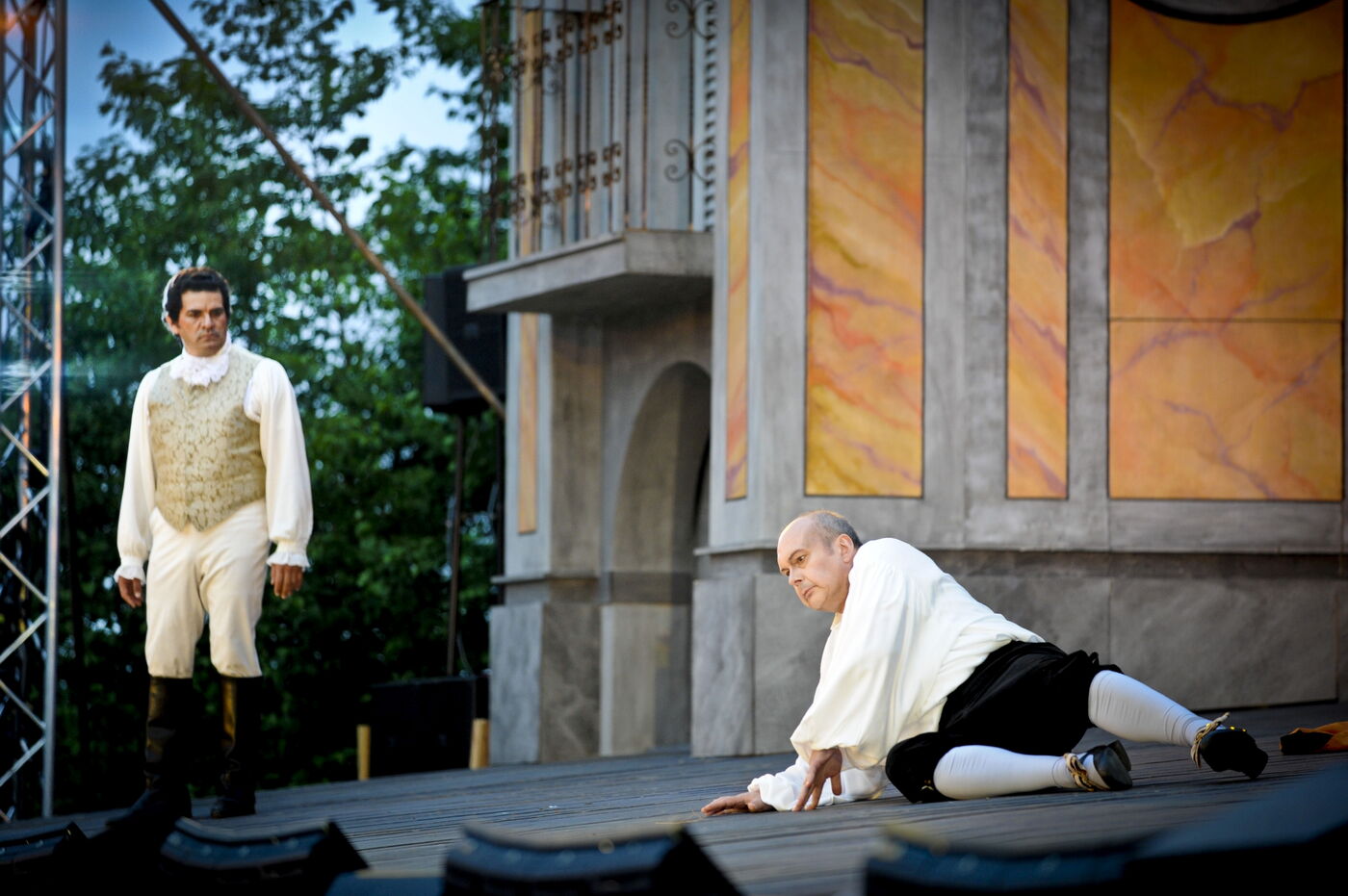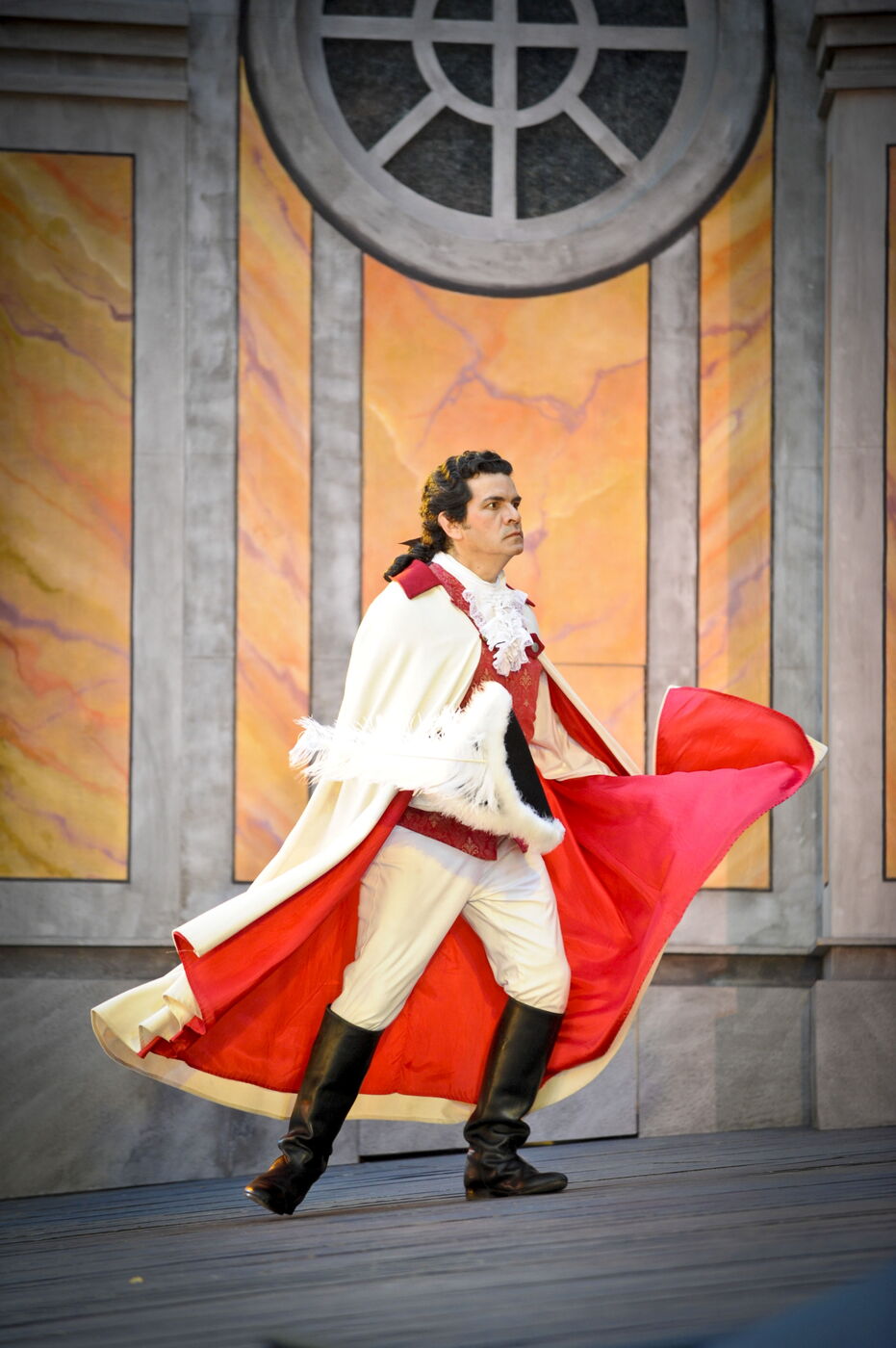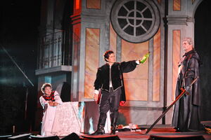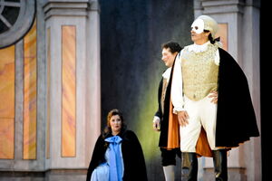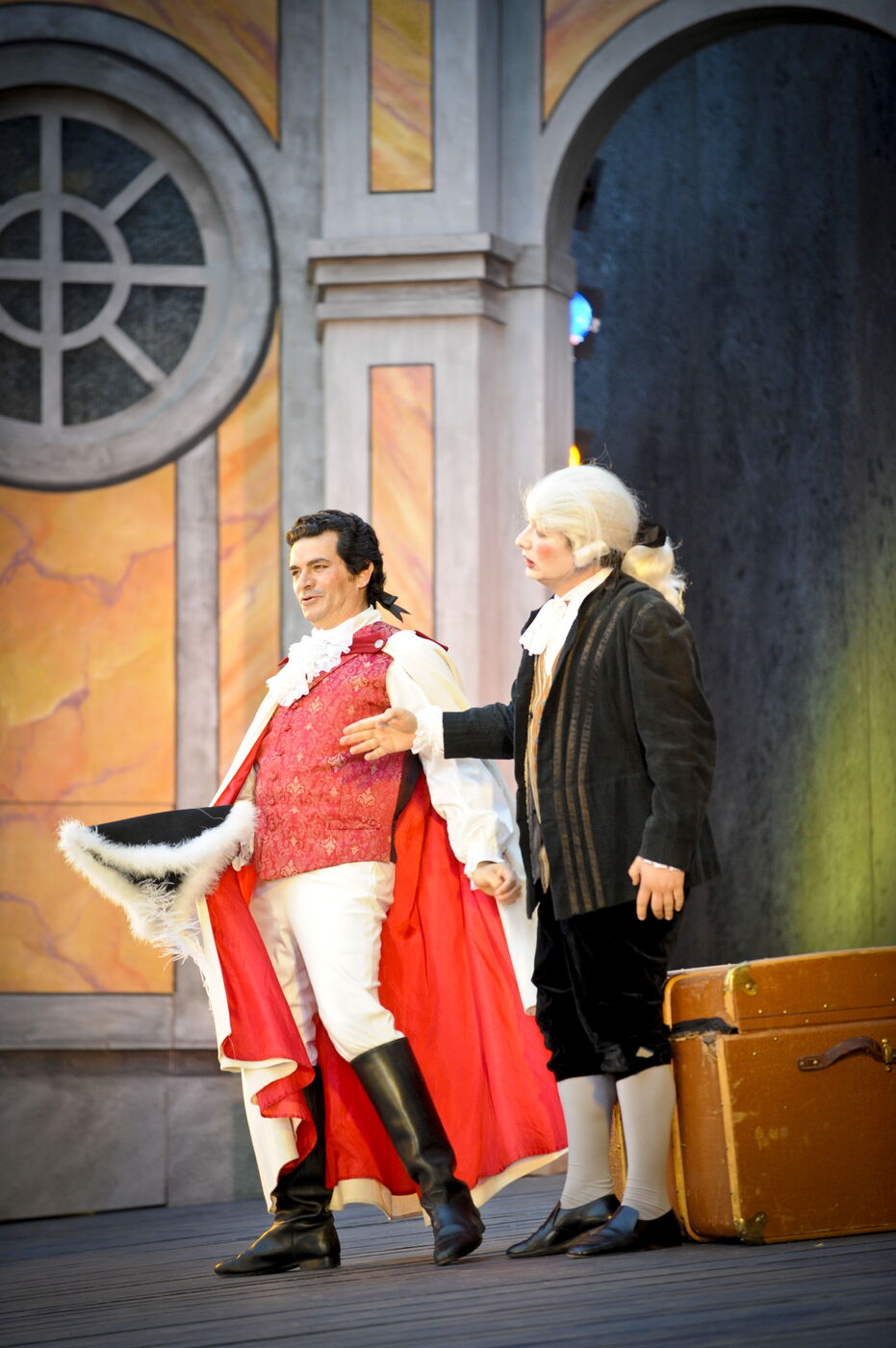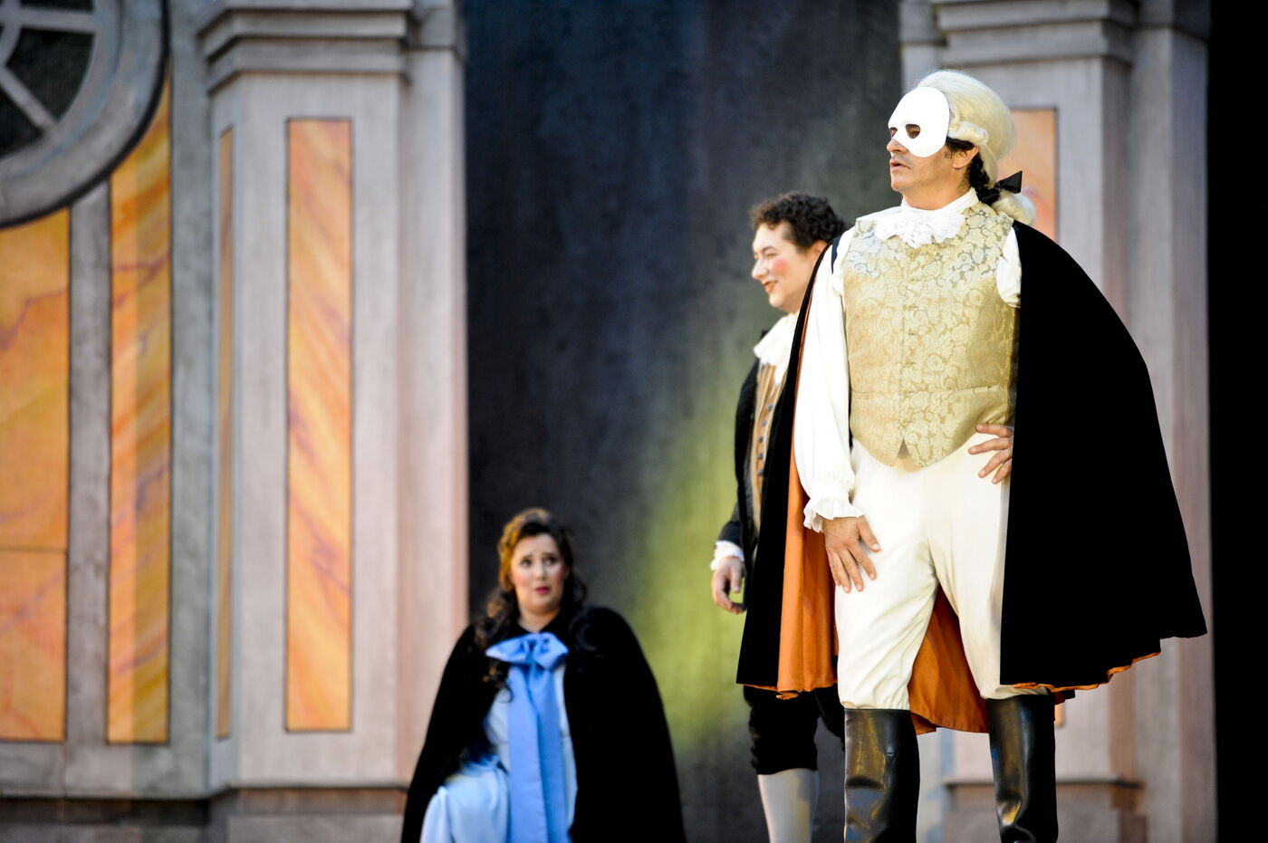 Der Diener Leporello steht missgelaunt Schmiere, während Don Giovanni, sein maskierter Herr, die schöne Donna Anna bedrängt. Sie ist die Tochter des Komturs, des obersten Verwalters kirchlichen Besitzes. Anna ist verlobt und wehrt sich gegen die Zudringlichkeiten des Sittenstrolchs.