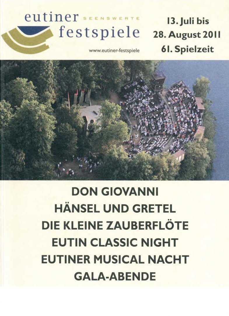 „Mensch. Natur. Kultur". Mit diesem Slogan kündigen die Eutiner Festspiele und ihre Initiatoren im Jahr 2011 einen abwechslungsreichen Opernsommer auf dem „Grünen Hügel" an. Die Eutiner Festspiele stehen für eine stimmige Verbindung zwischen Natur und Kultur. Seelage und Waldbühne im Eutiner Schlosspark bilden dabei die ideale Kulisse für ein attraktives und vielseitiges Musikprogramm. Dieses spricht mit seiner Vielseitigkeit sowohl den versierten Musikkenner, als auch den musikinteressierten Laien an. Auch für Familienausflüge werden Veranstaltungen geboten. Die Eutiner Festspiele setzen damit ihre 60-jährige Tradition als volksnahe große Freilichtoper fort.