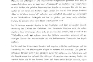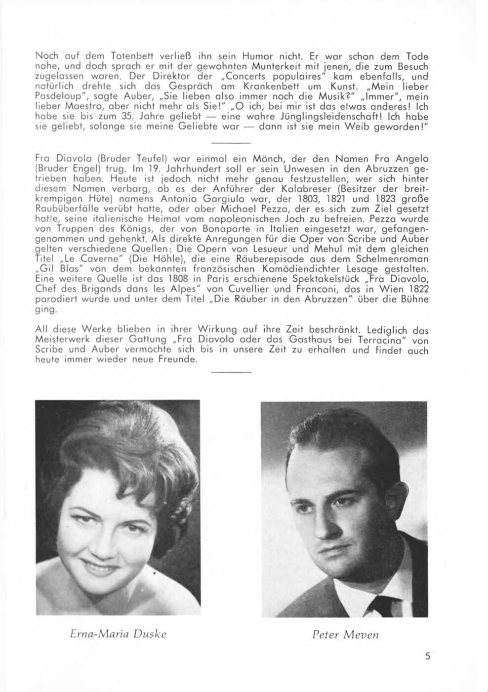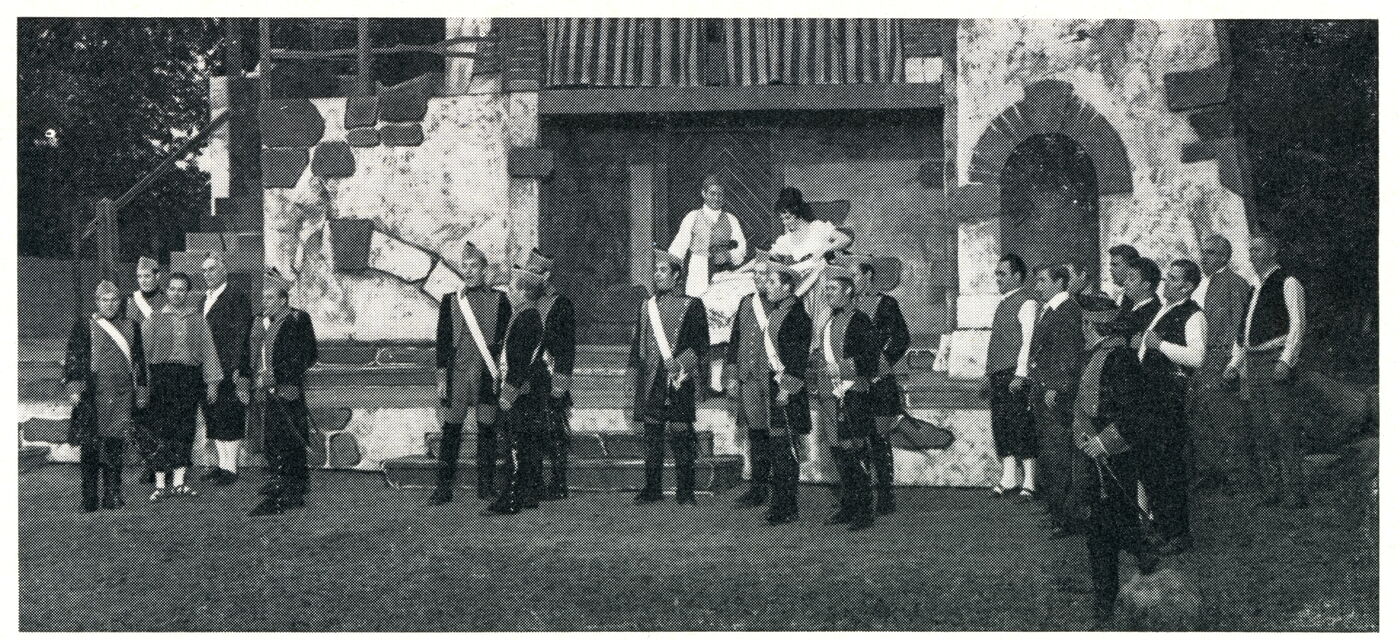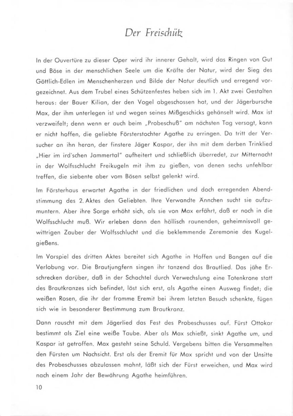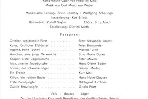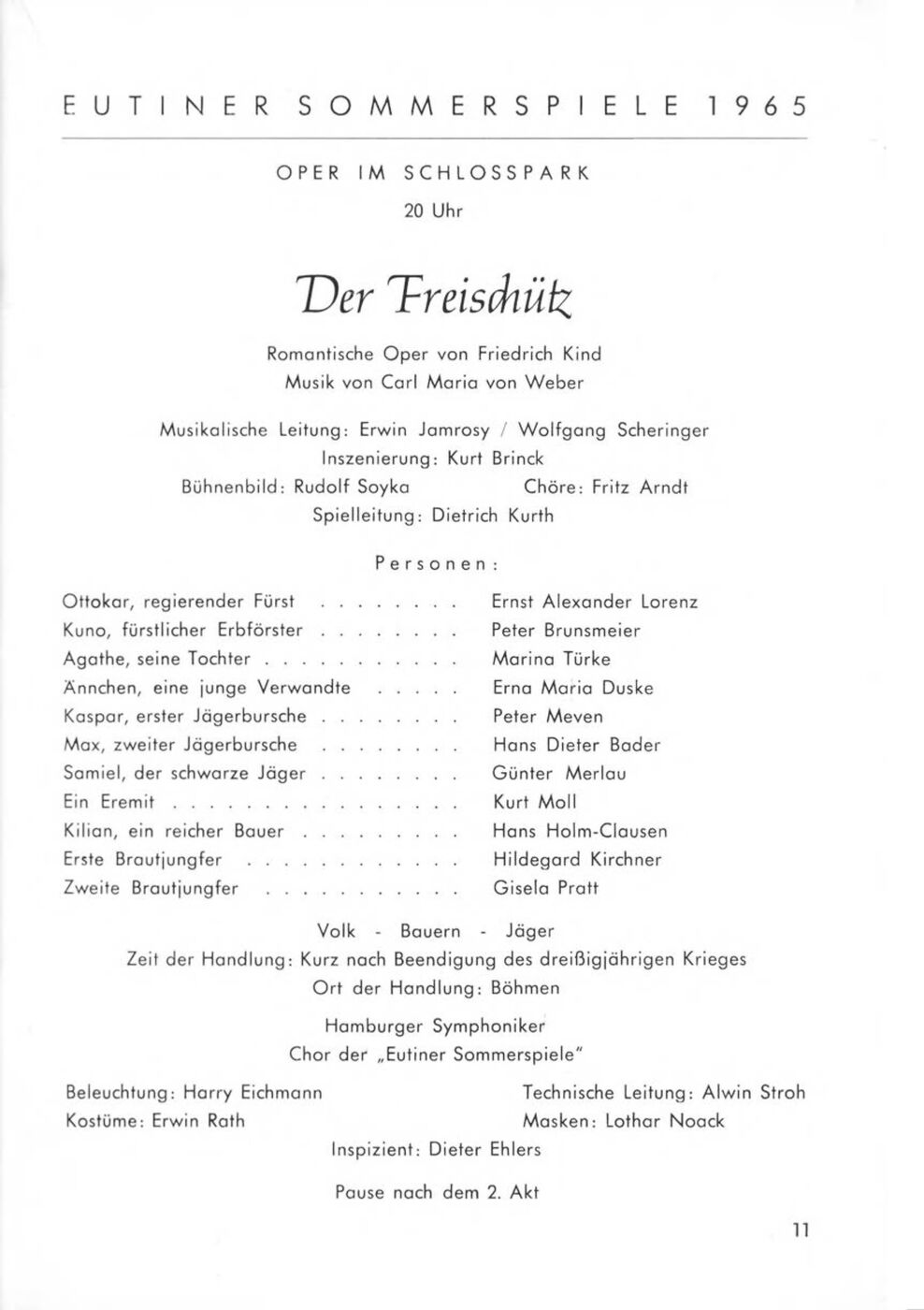 Bedeutende Kräfte deutscher Opernhäuser debutieren in dieser Freilicht-Oper, die zu den eigenartigsten ihrer Art in Deutschland zählt. Immer steht Weber's FREISCHÜTZ auf dem Spielplan, der — jährlich wechselnd — durch ein oder zwei weitere Opern ergänzt wird: Im fünfzehnten Spieljahr 1965 werden aufgeführt: